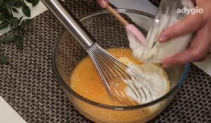 - Pune intr-un bol ouale peste care sa adaugi erithritolul, esenta de vanilie si cea de portocala.
